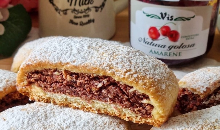 Una volta riposata, stendete la frolla creando un rettangolo spessomezzo centimetro e aggiungere il ripieno di al centro. Arrotolate su se stessi i rotoli farciti creando una sorta di strudel, tagliare a fette spesse 3 cm e posizionate i biscotti su placca da forno rivestita da carta forno.