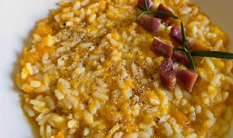 Tagliate a cubetti la zucca e cuocete in padella con lo scalogno e del rosmarino tagliuzzato, fino a farla diventare cremosa. Mettete i cubetti di crudo in una padella calda e fateli diventare croccanti.