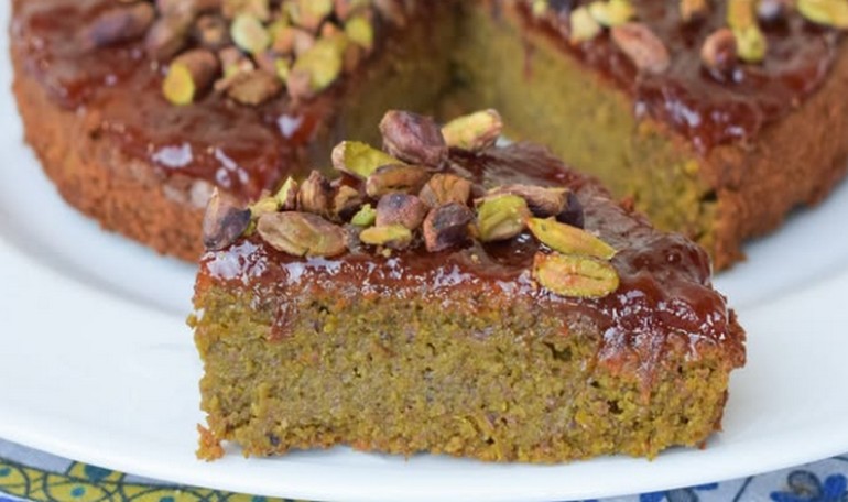 Versate l’impasto ottenuto in una teglia rotonda (17/18 cm di diametro), precedentemente rivestita con carta da forno, ed infornate a 170° per 30 minuti in modalità ventilata. Quando la torta sarà fredda, guarnite con la confettura di susine e con una spolverata di pistacchi tritati grossolanamente.